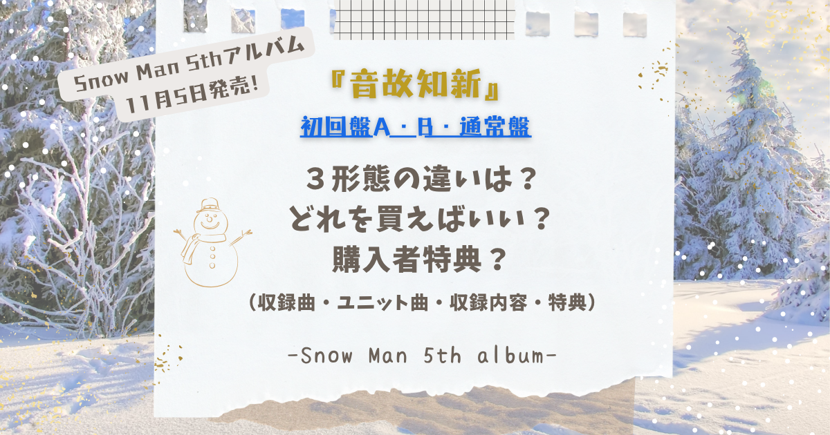 この記事では、SnowMan5thアルバム『音故知新』について、3形態(初回盤A・B・通常盤)の違いや予約特典、ユニット曲について我が家の体験談も交えながらご紹介していきます。