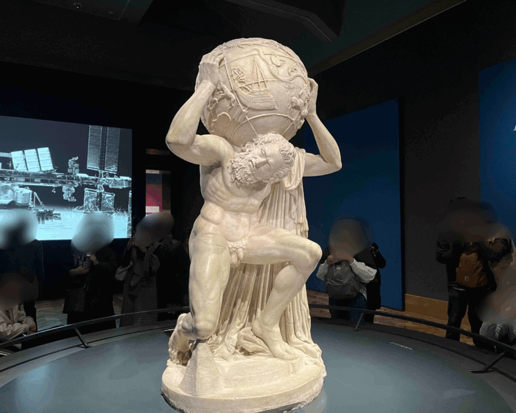 古代ローマ時代、西暦150年頃の作品で、高さ約2メートル・重さ約2トン。ギリシャ神話の神「アトラス」が天球儀を肩に担ぐ様子を表しています。