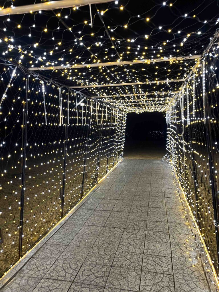 夕食会場からは琵琶湖が一望できるのですが、夜は真っ暗・・・何やらお庭の方はキラキラ?!夕食後に外へ出てみると「光のトンネル」がありました。