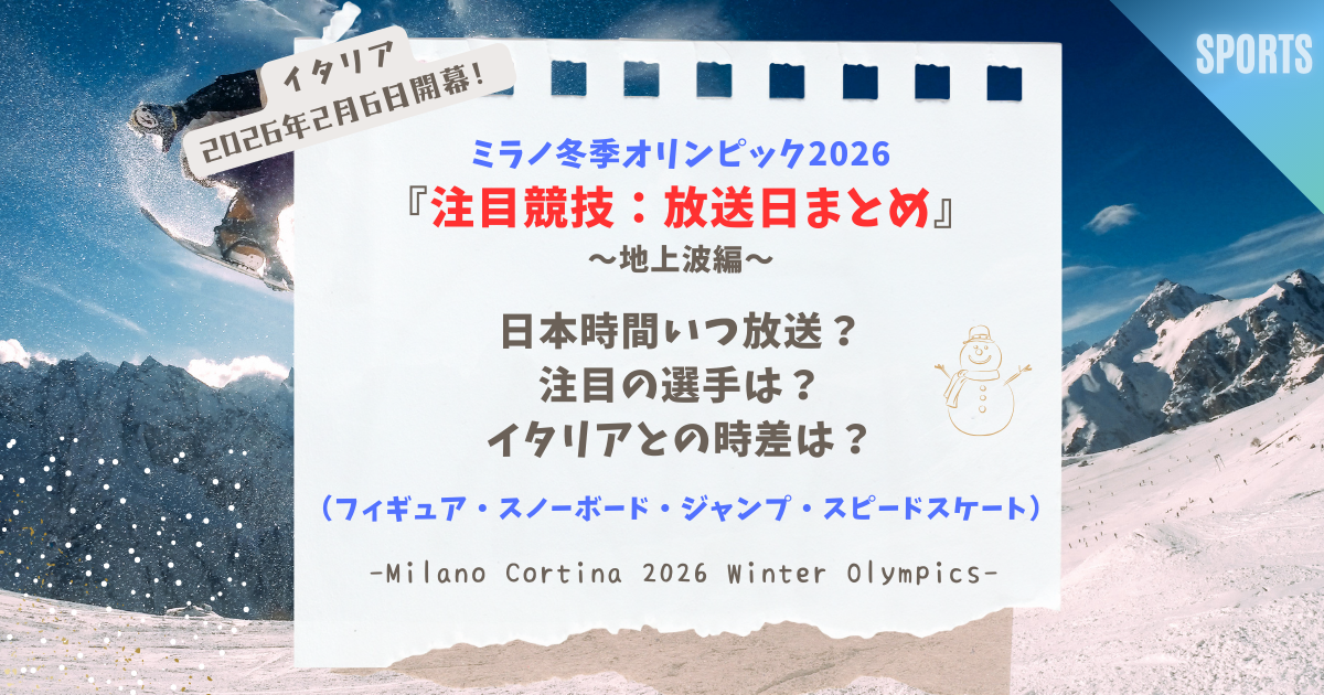 今回は『ミラノ冬季オリンピック2026』について、注目の4競技(フィギュアスケート・スノーボード・スキージャンプ・スピードスケート)地上波の放送日・選手情報をお伝えしました。