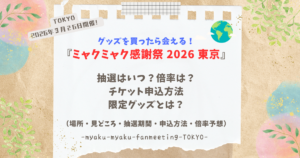 今回は『ミャクミャク感謝祭in大阪』について、イベント詳細・見どころ・参加方法・グッズ・抽選期間・チケット購入方法についてお伝えしました。