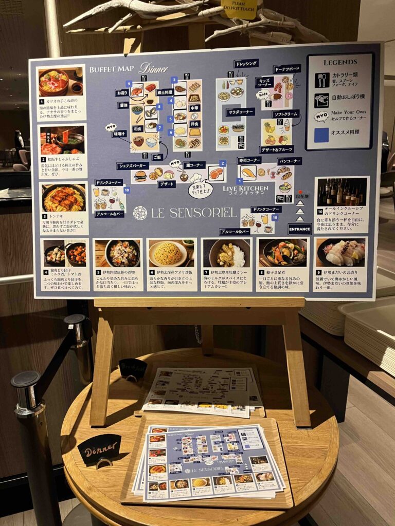 先ほどのラウンジ時間はどこへやら?やる気満々でレストラン会場へ到着しました。広々としたレストラン会場には美味しそうなお料理がずらり!