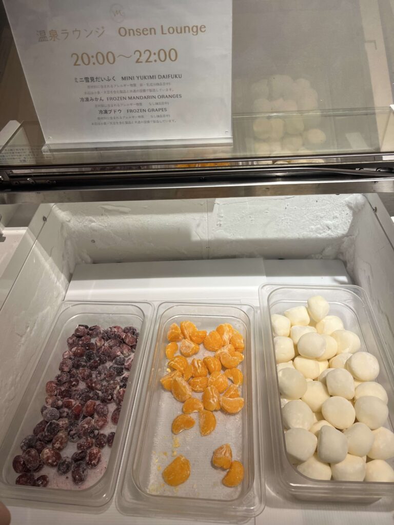 お風呂だけでなく、『温泉ラウンジ』もとっても癒しの空間。夕食後の20:00〜22:00の間は雪見だいふく・冷凍みかん・冷凍ぶどうとひんやり冷たい食べ物も体に沁みます。