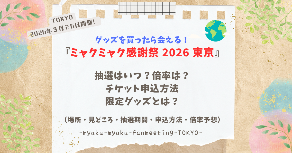 今回は『ミャクミャク感謝祭in東京』について、見どころ・参加方法・グッズ・抽選期間・チケット購入方法・倍率についてお伝えしました。