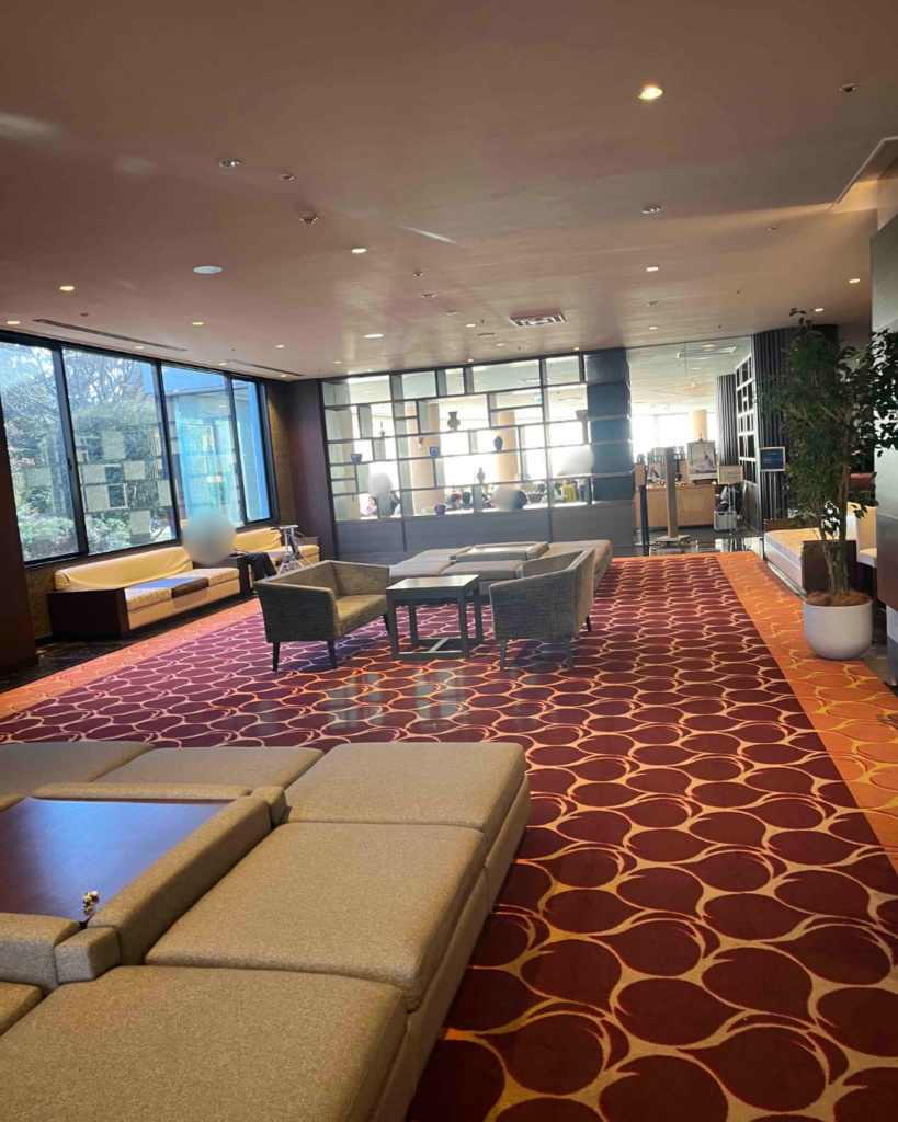 ロビーはとても広々としてゴージャスな雰囲気。ロビー前にはゆったりとくつろげるソファもあり、チェックインが終わるまでホッとできます。