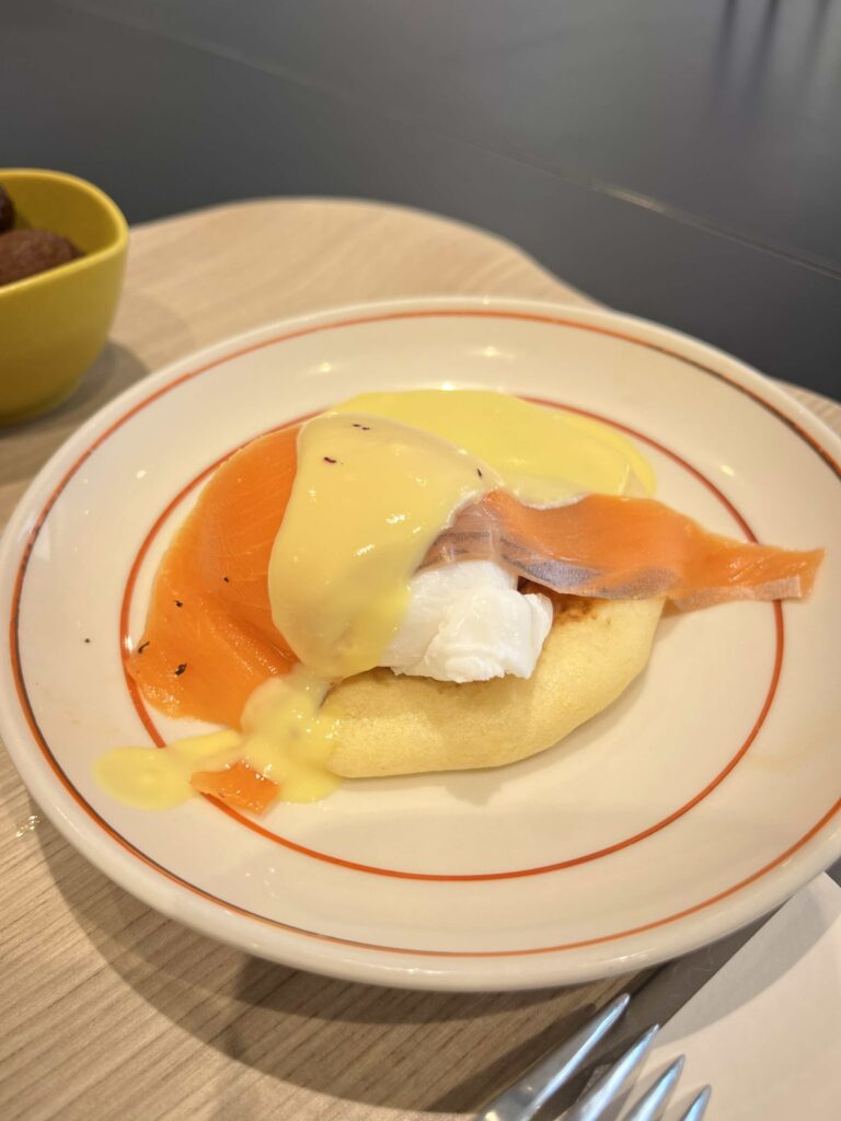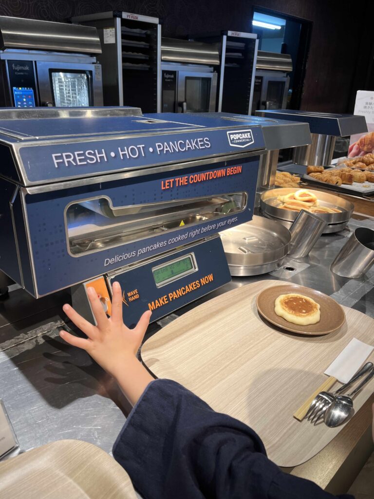 それ以外にも、グランドメルキュールの朝食といえばエッグベネディクト!子どもたちは自分で機械を操作するのが楽しくて、毎度のパンケーキに大喜び♪
