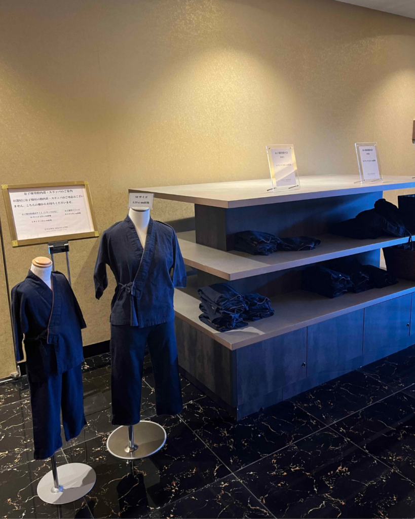 浴衣は大人用はお部屋にセットされていますが、ロビー横には、子ども用の作務衣(M・L)があります。子ども用は数に限りがあるので、利用される方は早めに確保しておくことをおすすめします。